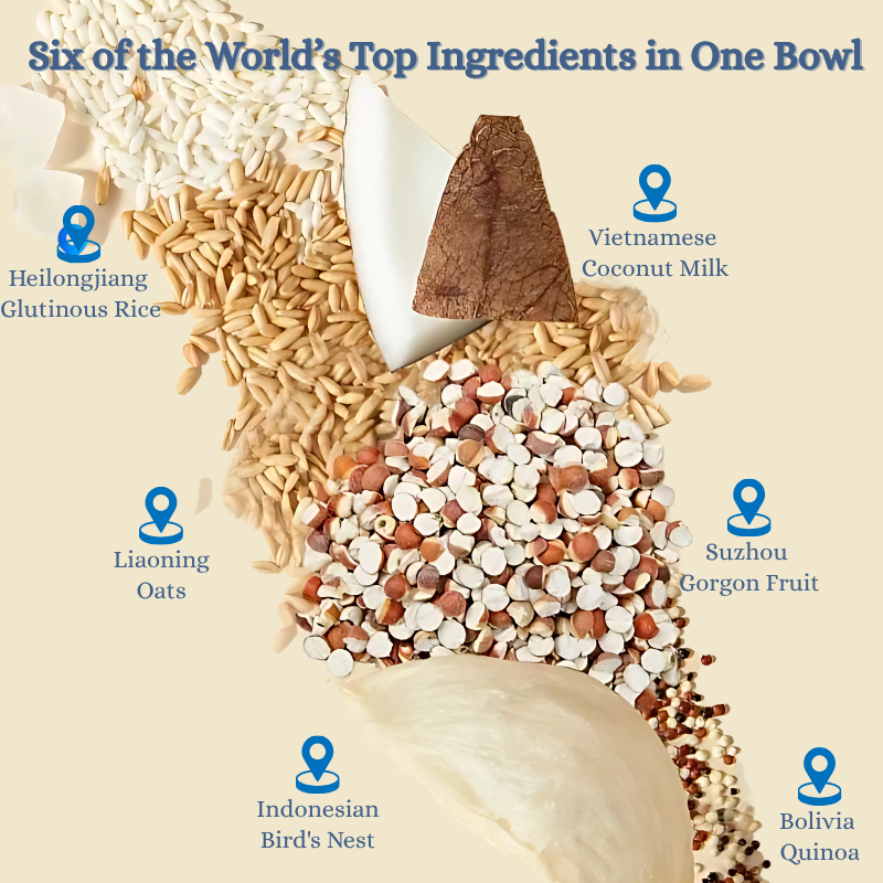 | Purified Water | Bird’s Nest | Coconut Milk | Gorgon Fruit (Euryale Seeds) | Glutinous Rice | Oats | Quinoa | Rock Sugar |