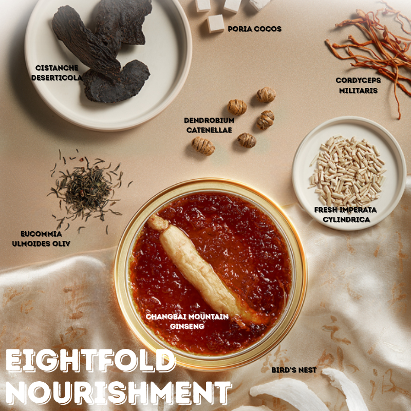 | Bird's Nest | Ginseng | Cistanche (Cistanche Deserticola) | Male Eucommia Flower | Cordyceps Militaris | Dendrobium Officinale | Poria Cocos (Fu Ling) | Fresh Imperata Root |
